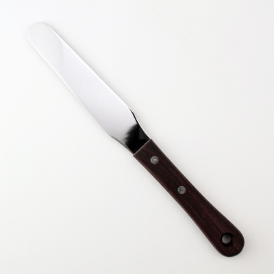 デコレーションの仕上げの際、クリームを塗る時に使用するスパチュラ(パレットナイフ)です。刃はしなりの良いステンレス、ハンドル部は手になじみやすい木柄を使用しています。