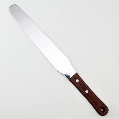 デコレーションの仕上げの際、クリームを塗る時に使用するスパチュラ(パレットナイフ)です。刃はしな りの良いステンレス、ハンドル部は手になじみやすい木柄を使用しています。