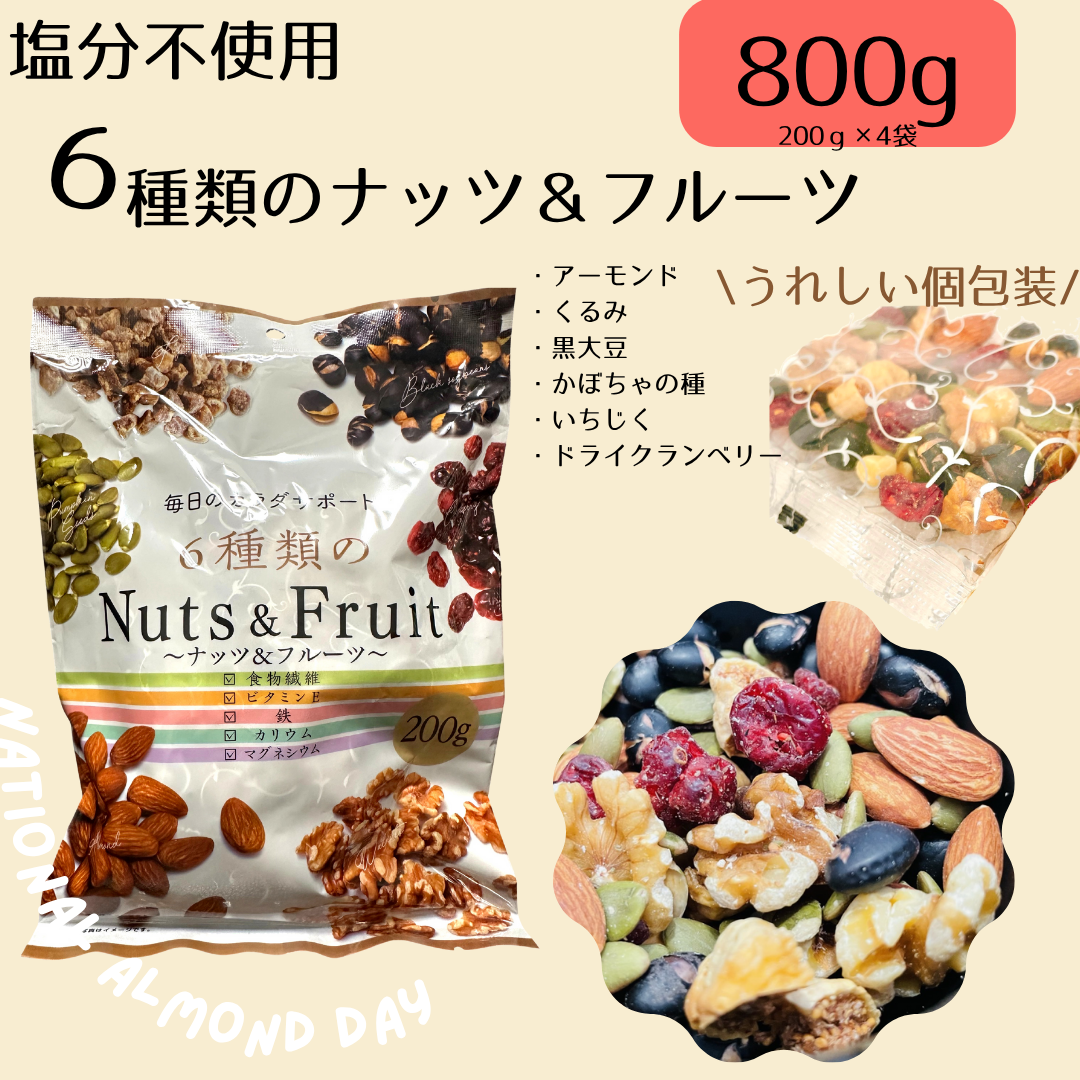江戸承 6種類のナッツ&フルーツ200g(×4袋セット) 800g ミックスナッツ 無塩 送料無料 ハース