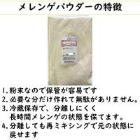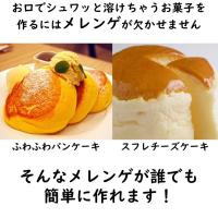 | 用途 | 焼きメレンゲ マカロン タルト パウンドケーキ ガトーショコラ ガトーケーキ チョコレートムース ブッセ メレンゲパイ メレンゲクッキー スフレチーズケーキ ティラミス ガトーマジック 魔法のケーキ マジックケーキ ホットケーキ カップケーキ ダックワーズ ロールケーキ クラウドブレッド ふわとろオムレツ スープ ポタージュ カルボナーラ |