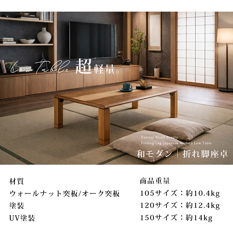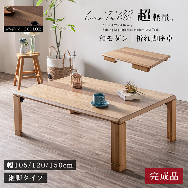 座卓 軽量 折りたたみ ローテーブル 幅105/120/150cm 継脚付 ナチュラル ブラウン ウォールナット突板/オーク突板 リビングテーブル 折れ脚 おしゃれ 完成品