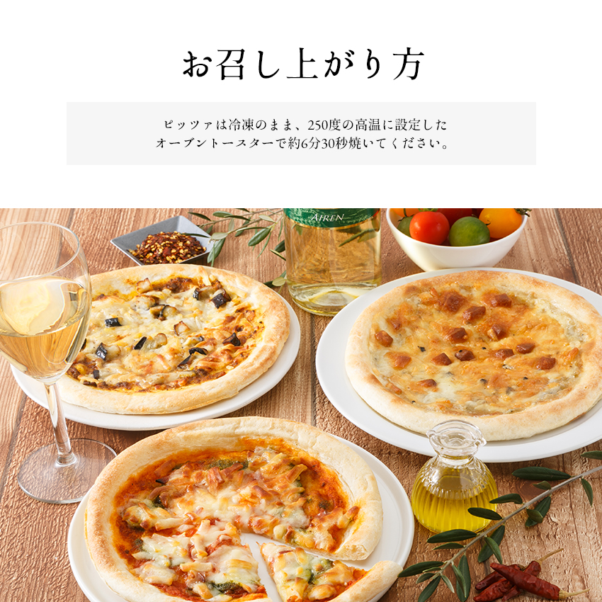 | 原材料 | ボロネーゼのピッツァ:クラスト(小麦粉(国内製造)、食塩、糖類(麦芽糖、ぶどう糖)、イースト、粉末デュラム小麦サワー種)、ナチュラルチーズ、揚げなす、粗ごしトマト、トマト・ジュースづけ、牛肉、ソテードオニオン、ワインエキス、にんじん、トマトペースト、植物油脂(大豆油、オリーブ油)、食塩、ガーリック、香辛料、ビーフエキス調味料、砂糖/セルロース、増粘剤(加工デンプン)、調味料(アミノ酸等)、カラメル色素、(一部に小麦・乳成分・牛肉を含む) / ピッツァ マルゲリータ:クラスト(小麦粉(国内製造)、食塩、糖類(麦芽糖、ぶどう糖)、イースト、粉末デュラム小麦サワー種)、ナチュラルチーズ、粗ごしトマト、ベーコン、バジルペースト、なたね油、食塩/セルロース、増粘剤(加工デンプン)、リン酸塩(Na)、調味料(アミノ酸)、酸化防止剤(V.C)、発色剤(亜硫酸Na)、(一部に小麦・乳成分・豚肉を含む) / 黒トリュフと4種のチーズのピッツァ:クラスト(小麦粉(国内製造)、食塩、糖類(麦芽糖、ぶどう糖)、イースト、粉末デュラム小麦サワー種)、ナチュラルチーズ、牛乳、なたね油、バター、トリュフ(中国)、小麦粉、食塩、香辛料/セルロース、増粘剤(加工デンプン)、香料(一部に小麦・乳成分を含む) 原材料配合割合: ナチュラルチーズ(モントレージャックチーズ、モッツァレラチーズ、ゴーダチーズ、ゴルゴンゾーラチーズ)21.7% トリュフ0.2%(仕込み時) |
