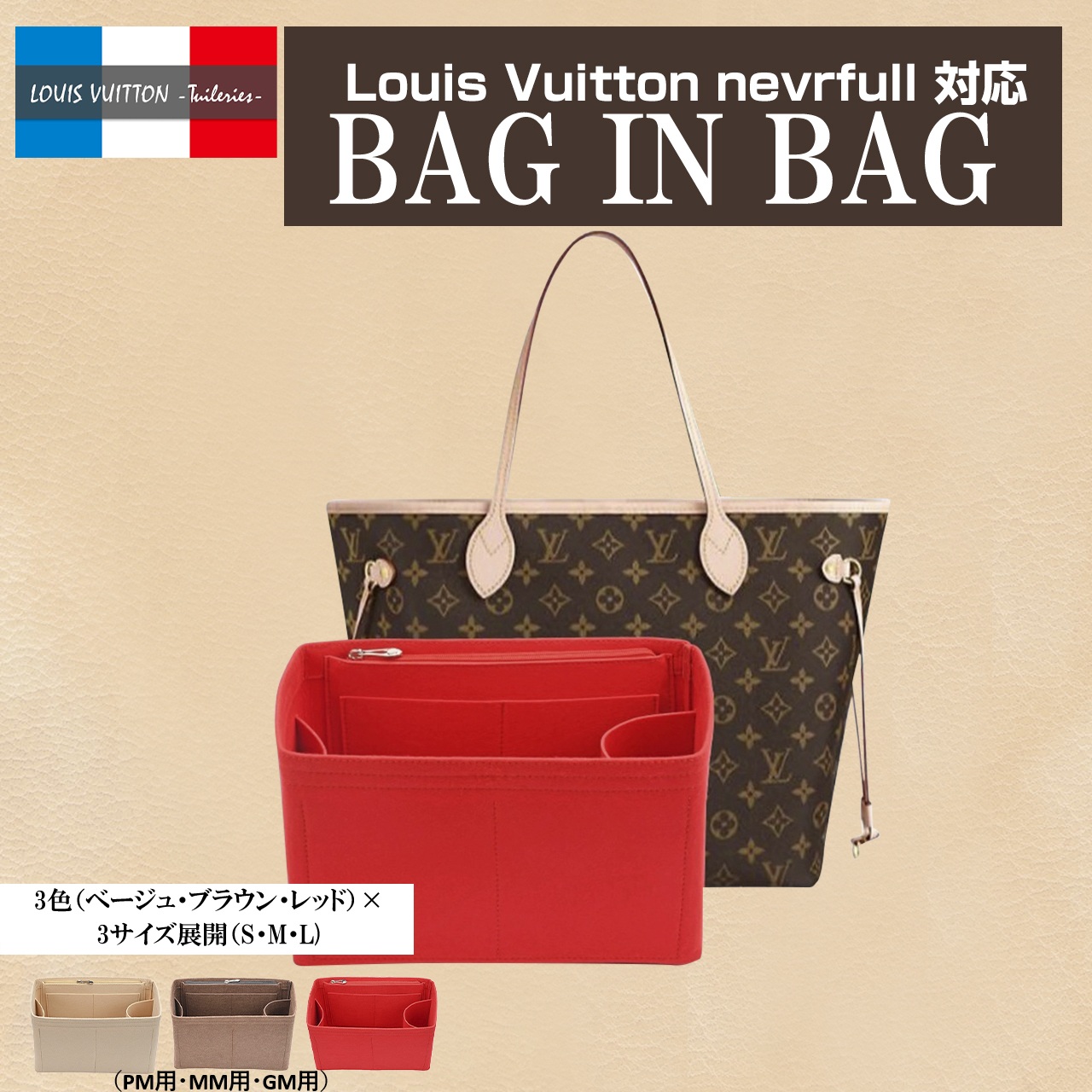 (在庫処分Sale) ネヴァーフル バッグインバッグ PM MM GM ルイヴィトン用 インナーバッグ 自立 収納 整理 (Louis Vuitton・NEVERFULL)