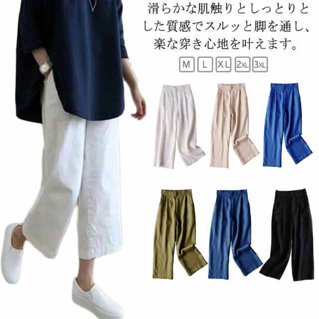 綿麻 春夏 パンツ リネン 薄手 ワイドパンツ ゆったり ボトムス ウエストゴム 通気性 きれいめ 9分丈 春 夏 コットン レディース 大きいサイズ