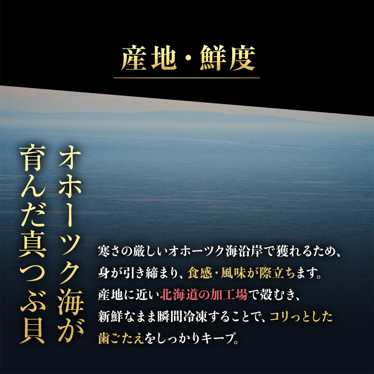 原料はロシア産の真つぶ貝を使用し、産地に近い北海道で加工後、鮮度を保ったまま瞬間冷凍しています。
