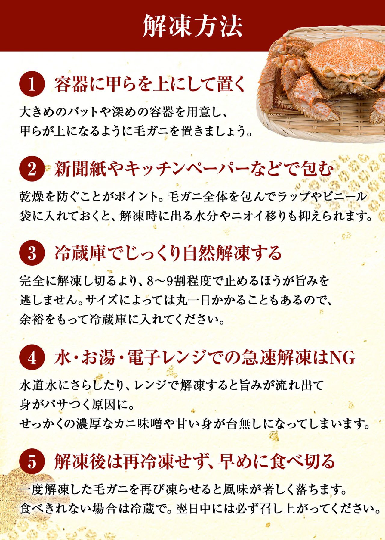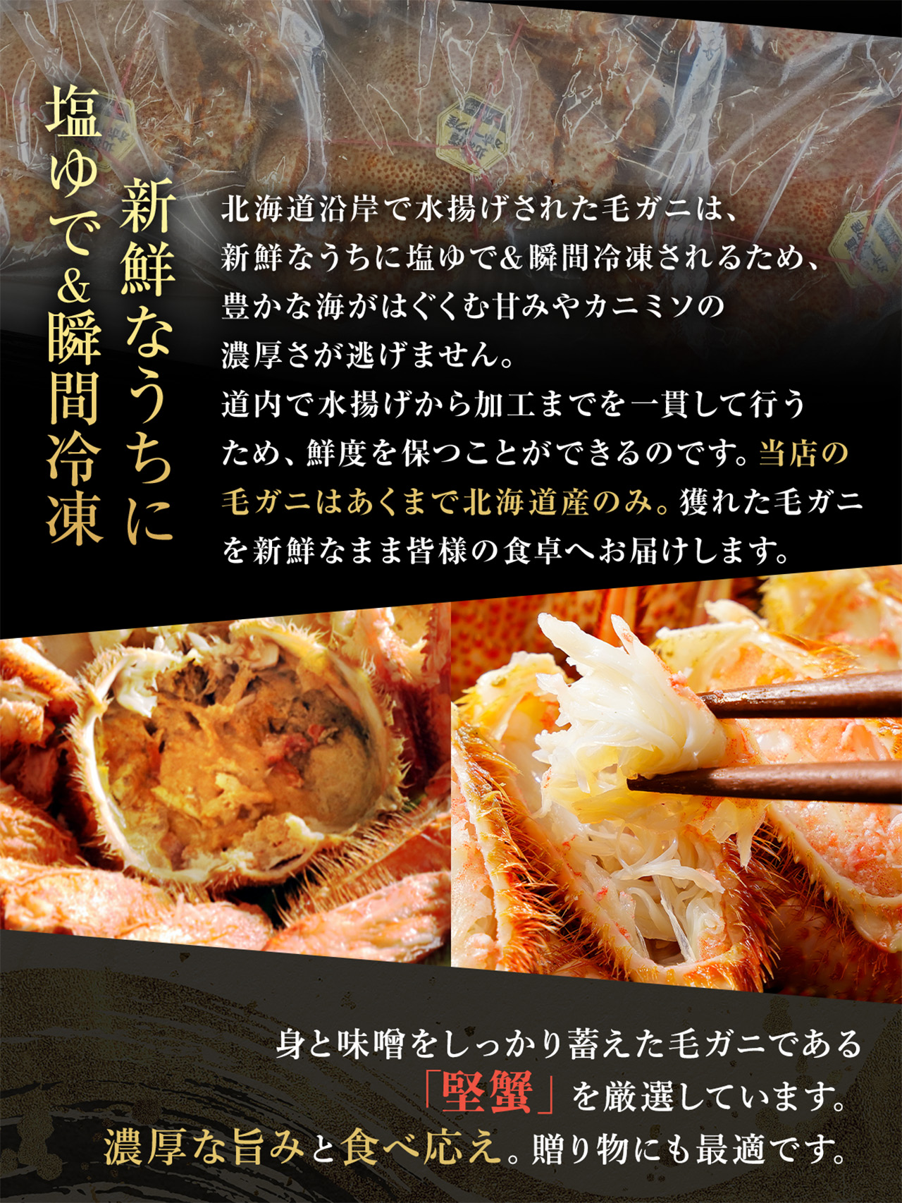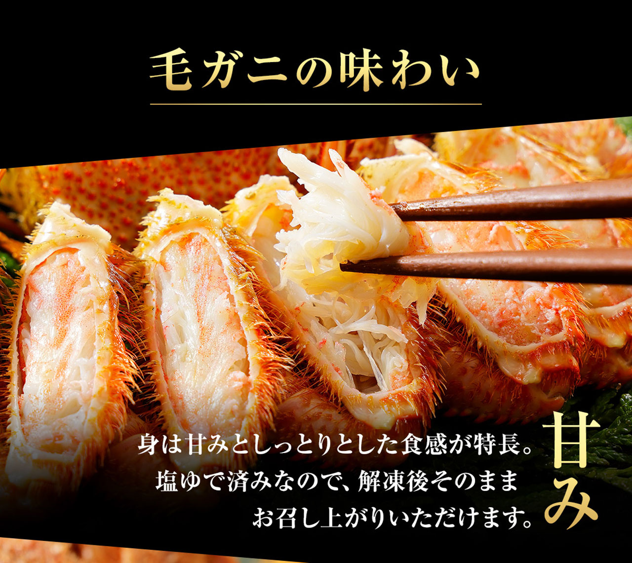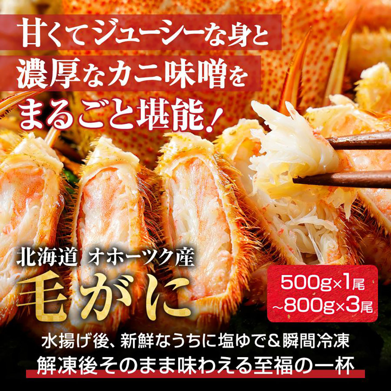 オホーツク海で漁獲した旬の毛ガニを旨みそのままに瞬間冷凍。