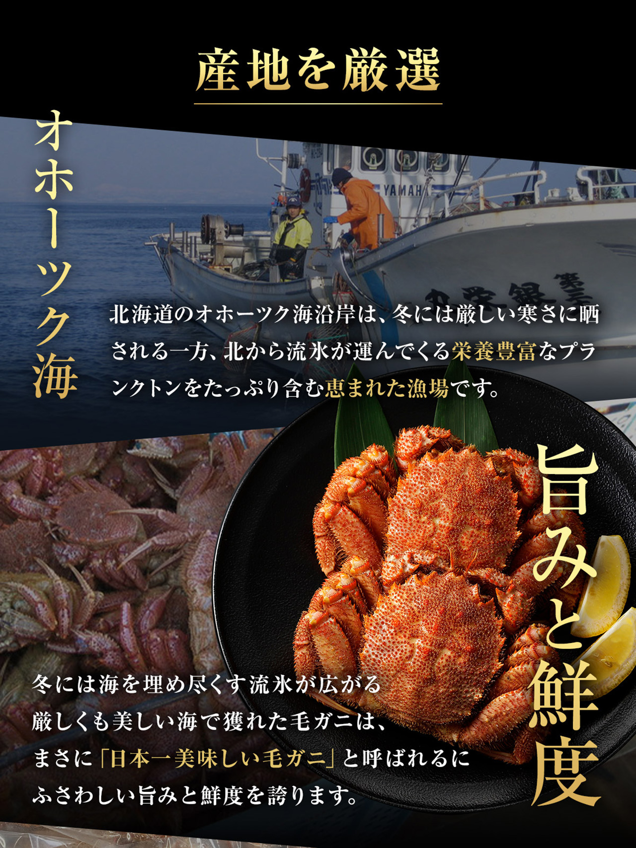 毛ガニは厳しい冷たさの海で旨みをじっくりと蓄えるため、日本一厳しい冷たさのオホーツク海で獲れた毛ガニは、日本一おいしい毛ガニです。