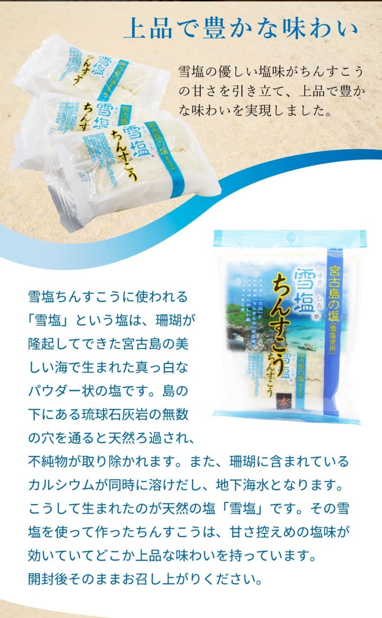 沖縄名物ちんすこうに宮古島の塩「雪塩」を組み合わせた商品です。ミネラル分たっぷりの「雪塩」がちんすこうの甘みを引き立てていて、沖縄土産でも、人気の商品です。ティータイムやおやつ時間にもオススメです。