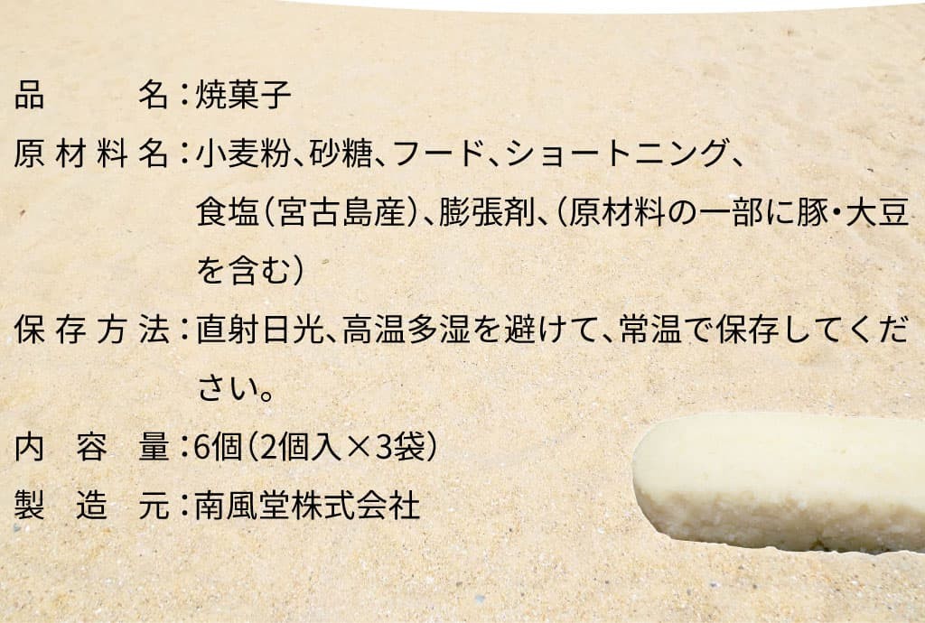 原材料名:小麦粉、砂糖、フード、ショートニング食塩(宮古島産)、膨張剤、(原材料の一部に豚・大豆を含む)