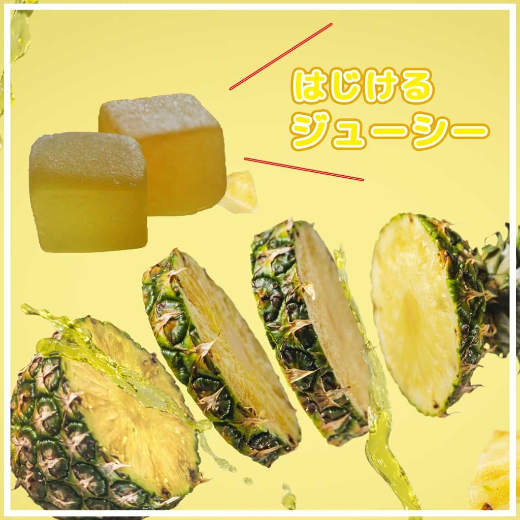 原材料名:水あめ(国内製造)、砂糖、ゼラチン、パインアップル果汁(沖縄県製造)、など