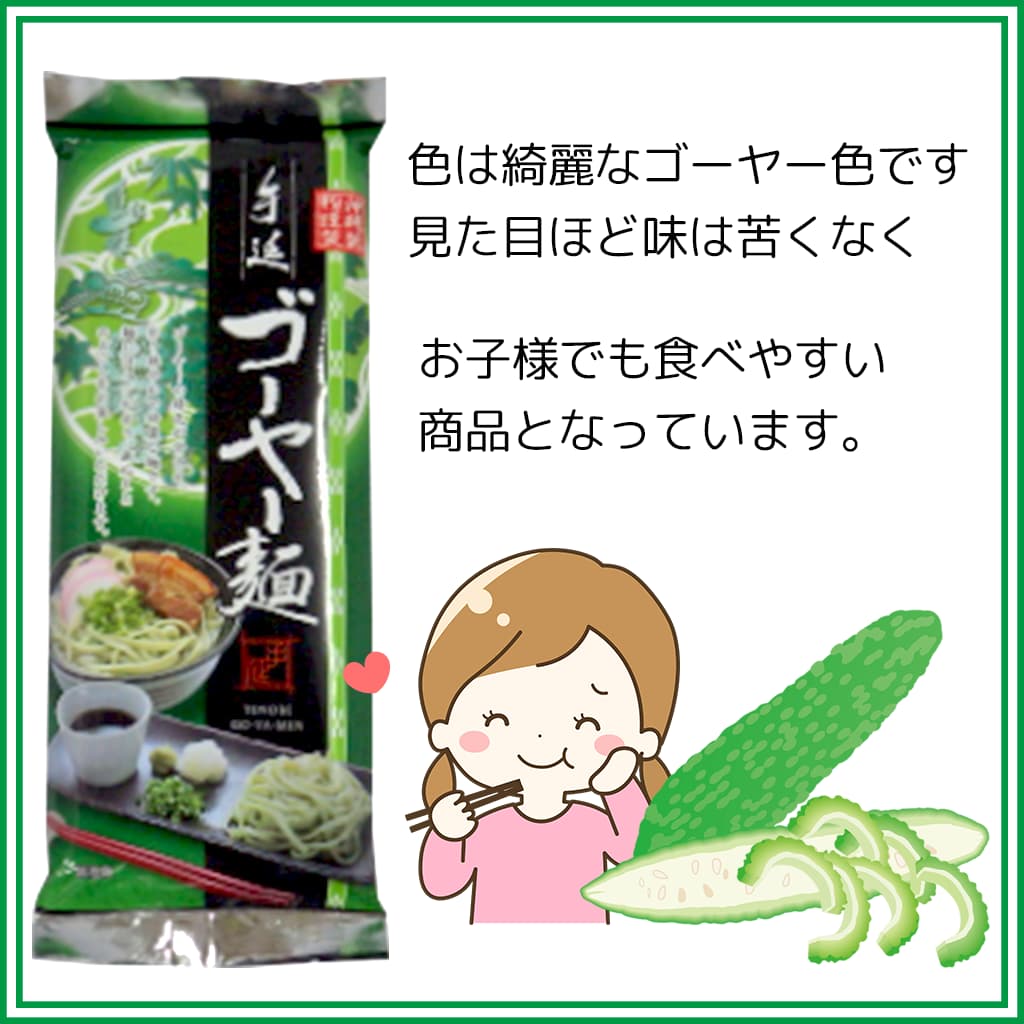 乾麺タイプの沖縄そば麺とゴーヤー麺です。麺にはコシがあり、歯ごたえとのどごしをお楽しみいただけます。なめらかなツヤとしっかりとしたコシの強さと歯ごたえが特徴の手延べ麺。沖縄そばだしは必要な分だけ使え、残った分は保存ができます。三枚肉などをトッピングや味のアクセントとして七味などを入れてもオススメです。