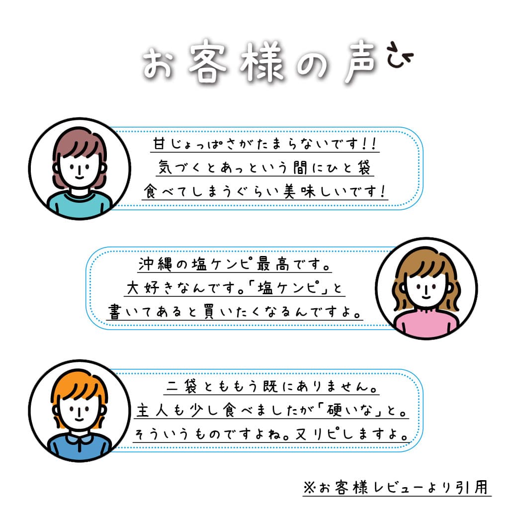 当店人気商品の1つです。塩けんびは、さつまいもをスティック状にカットして植物油でカラッと揚げ、砂糖と沖縄の海水塩を程よく浸透させた芋菓子です。さつまいもの甘みと塩の旨味が絶妙な味わいになっています。お茶のお供にオススメです。