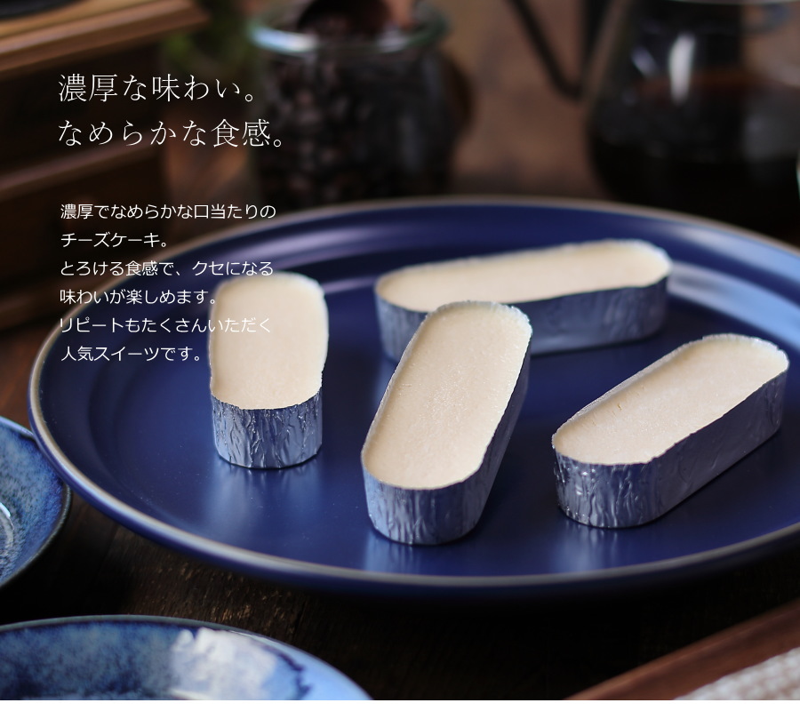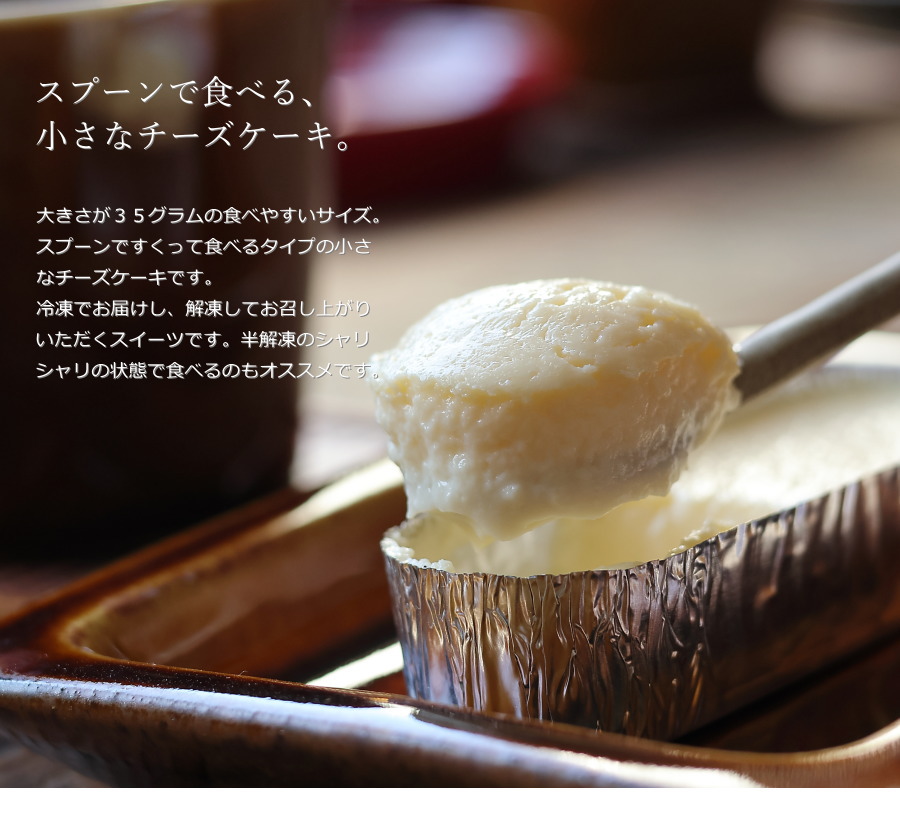 ひとつ35グラムの、食べやすいサイズの小ぶりなチーズケーキ。スプーンですくって食べるタイプのチーズケーキです。