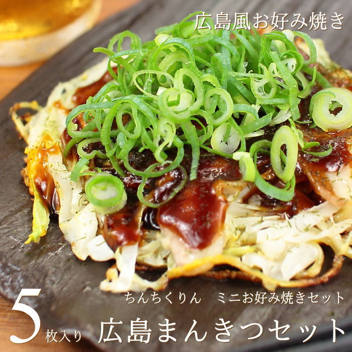 広島まんきつ!ミニお好み焼きセット。広島、東京、そしてアメリカでも店舗展開している人気お好み焼き店『ちんちくりん』から、ミニサイズの広島風お好み焼きをお届けいたします。