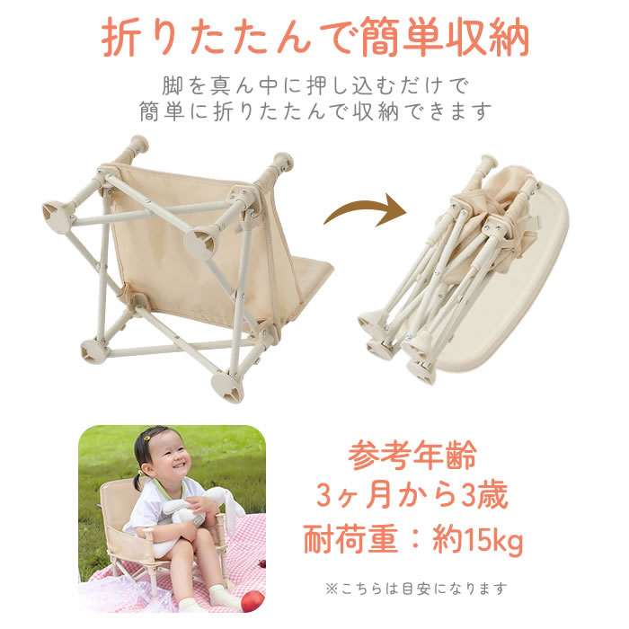 | ポイント | 折りたたみ式で持ち運べるベビーチェア!折りたたみ式で軽量コンパクト!持ち運びしやすい収納袋付きで室内だけでなくアウトドアなど外でもご利用頂けます。取り外し可能な食事テーブル付き!お出かけ先のでの食事に便利。付属の固定ベルトで椅子に固定することでハイチェアとしてもお使いいただけます。落下防止の3点ベルトで安心です。 |