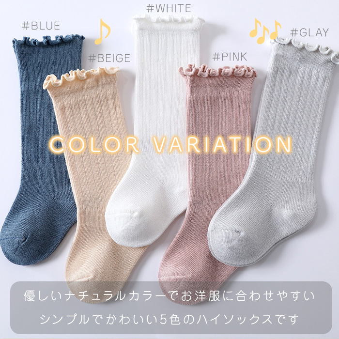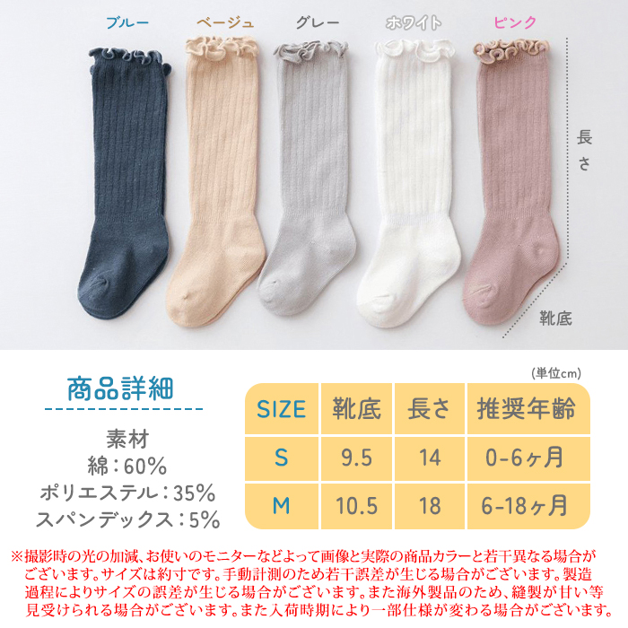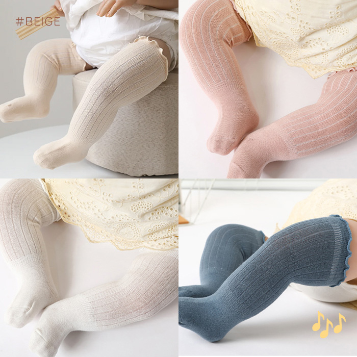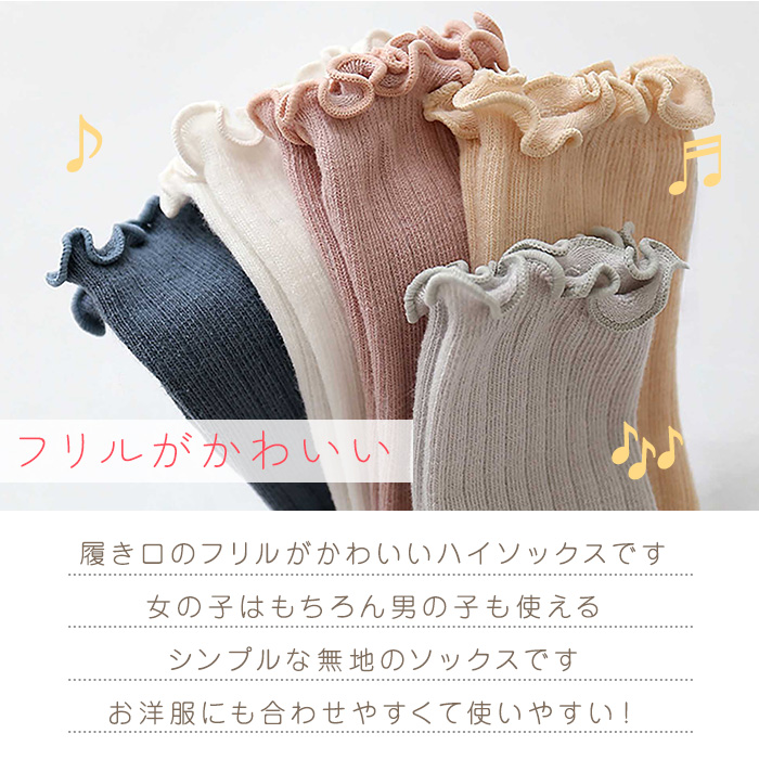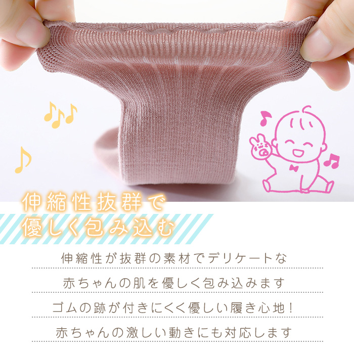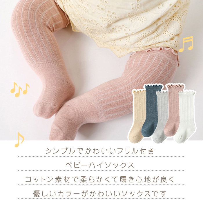 履き口がかわいいベビーハイソックス。シンプルで服に合わせやすい無地のベビー用ハイソックスです。伸縮性に優れた素材で履きやすい、程よいフィット感でズレにくい。肌に優しいコットン素材を使用しているので赤ちゃんも安心。優しいカラーで女の子だけでなく女の子も使えるソックスです。