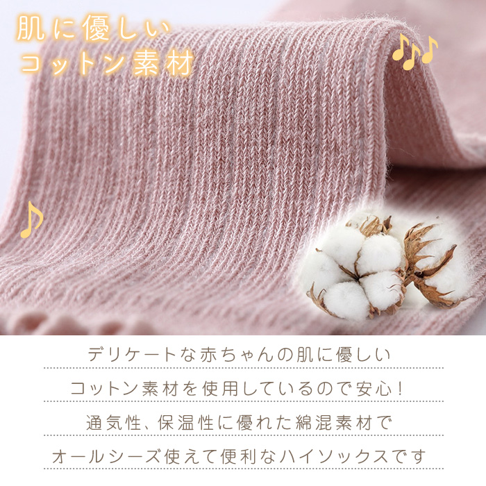 ポイント履き口がかわいいベビーハイソックス。シンプルで服に合わせやすい無地のベビー用ハイソックスです。伸縮性に優れた素材で履きやすい、程よいフィット感でズレにくい。肌に優しいコットン素材を使用しているので赤ちゃんも安心。優しいカラーで女の子だけでなく女の子も使えるソックスです。