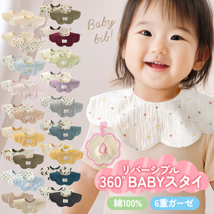 | ポイント | 綿100%で肌に優しい6重ガーゼのリバーシブルスタイ。360度どの方向でもよだれをキャッチします。シンプルで可愛いデザインで男の子にも女の子にもおすすめです。裏表でデザインが違うのでその日の気分に合わせてコーディネート。通気性・吸水性に優れたコットン素材で肌に優しく赤ちゃんも安心。スナップボタンで着脱もカンタンです。 |