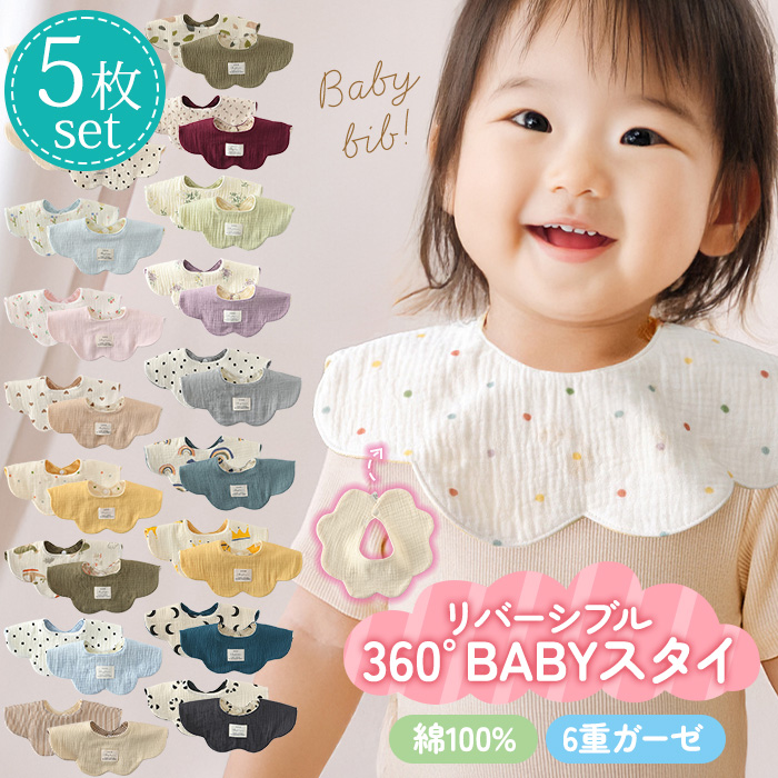 | ポイント | 綿100%で肌に優しい6重ガーゼのリバーシブルスタイ。360度どの方向でもよだれをキャッチします。シンプルで可愛いデザインで男の子にも女の子にもおすすめです。裏表でデザインが違うのでその日の気分に合わせてコーディネート。通気性・吸水性に優れたコットン素材で肌に優しく赤ちゃんも安心。スナップボタンで着脱もカンタンです。 |