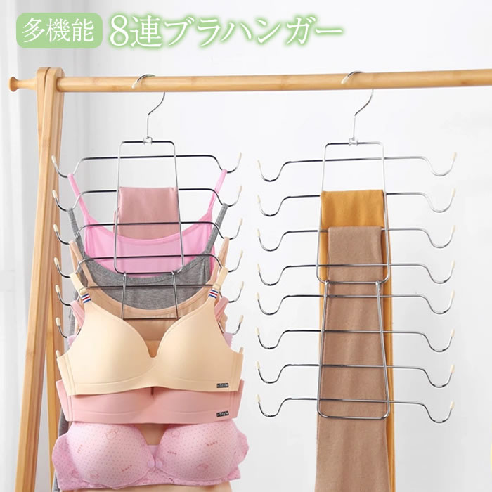 | ポイント | ブラジャーやキャミソールなどを省スペースで収納出来る多機能8連ブラハンガー。その他ネクタイや靴下・タイツ、ベルトにスカーフなどいろんな衣類が掛けれる多機能ハンガーです。滑り落ちないU字のフックで色んなものが掛けれます。丈夫なステンレス素材で変形しにくく長持ち。 |