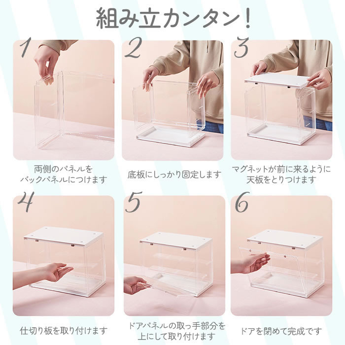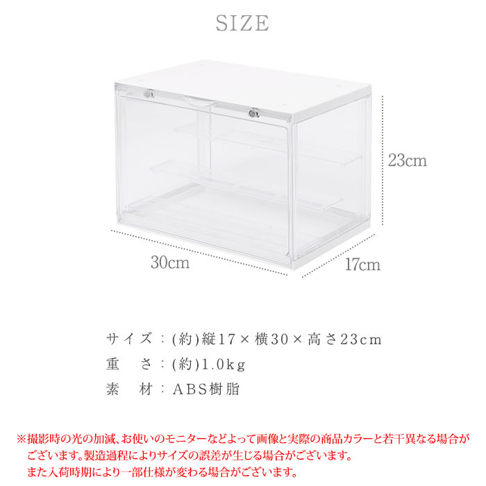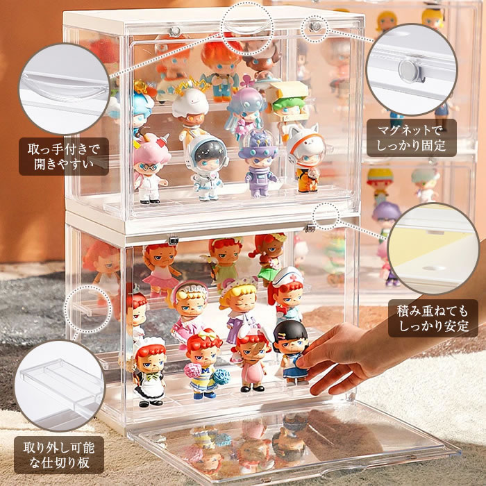 | ポイント | 積み重ねできるクリアできれいなコレクションケース。マグネット式のオープンドアで出し入れ簡単。飾る物のサイズに応じて取外し可能な3段仕切り付き。上面及び底面には凹凸があり積み重ねても倒れにくい。大切なフィギュアなどをホコリから守るコレクションケースです。 |