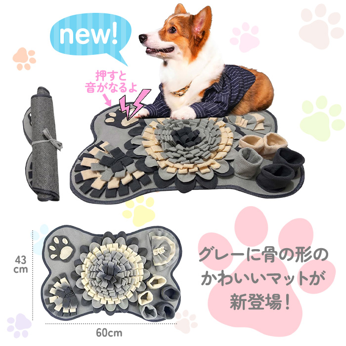 | ポイント | ワンちゃんの嗅覚を遊びながら鍛えるノーズワークマット!知育おもちゃとして人気でマットに隠したおやつを優れた嗅覚で探す遊びです。ストレス解消や運動不足に早食い防止におすすめです。マットの裏地には滑り止め加工付き。元気なワンちゃんが動き回っても滑らないので安心。おやつの隠し場所も多いので飽きずに長く遊ぶことができます。ワンちゃんだけでなくネコちゃんも遊べるマットです。 |