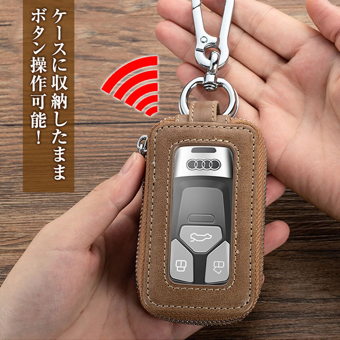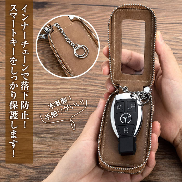 | ポイント | 手のひらサイズでコンパクトなスマートキーケースです。ダブルポケットで複数収納でき、片面は見やすい窓付きでケースに収納したままボタン操作できます。それぞれのポケットにインナーチェーンが付いており落下による紛失を防いでくれます。 |