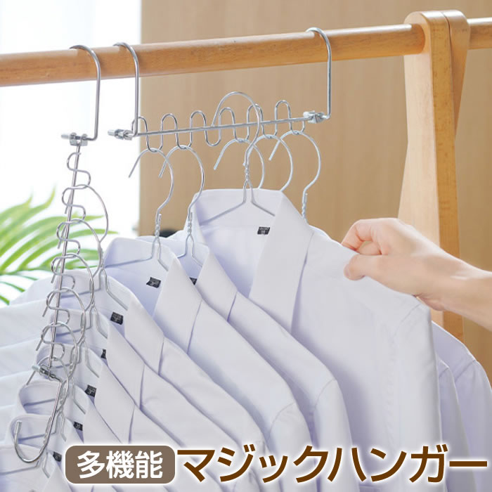 収納力アップ!省スペースでクローゼットすっきり!多機能マジックハンガー!縦横両用。タテ向きで省スペース!1本に12着掛けられるのでスッキリひとつにまとまります。頑丈なステンレス製で重たい冬服なども大丈夫!耐荷重約20kg。風で洗濯物がズレないので洗濯ハンガーとしてもご利用頂けます。