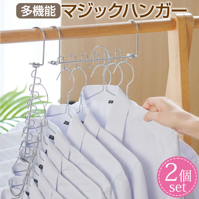 | ポイント | 収納力アップ!省スペースでクローゼットすっきり!多機能マジックハンガー!縦横両用。タテ向きで省スペース!1本に12着掛けられるのでスッキリひとつにまとまります。頑丈なステンレス製で重たい冬服なども大丈夫!耐荷重約20kg。風で洗濯物がズレないので洗濯ハンガーとしてもご利用頂けます。 |