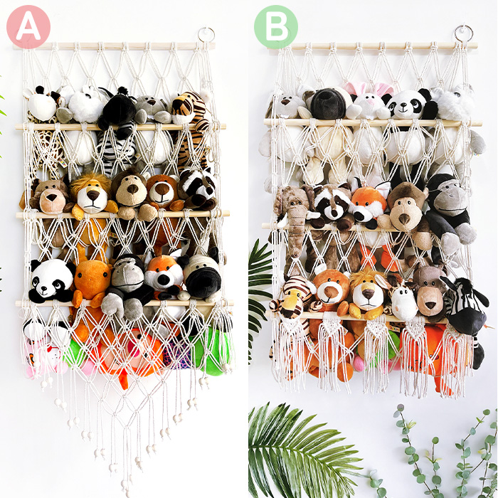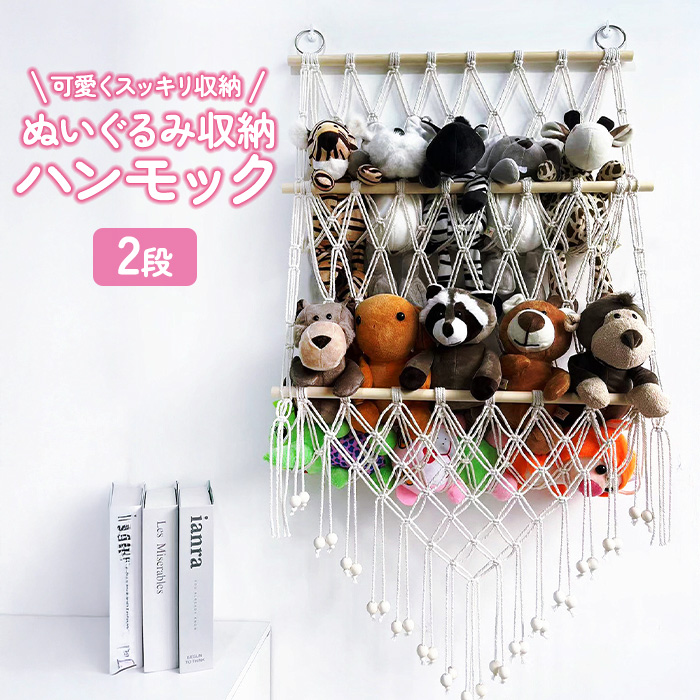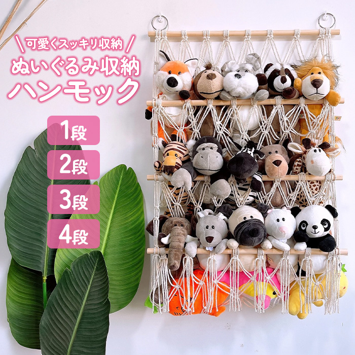 | ポイント | ぬいぐるみをたくさん収納できるハンモック!壁にかけてかけて収納するタイプで省スペースでスッキリ収納!収納量やお部屋の雰囲気に合わせて1〜4段まで選べます。インテリアにも馴染むナチュラルカラーで、ぬいぐるみをおしゃれに収納できます。取り付け簡単なフック付きですぐに設置可能!お子様のお部屋にぴったりなぬいぐるみ収納ハンモックです。 |