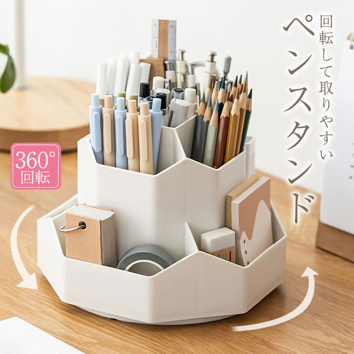 | ポイント | シンプルでおしゃれな回転するペン立て。9つの収納スペースで分類しやすい。ハサミやホッチキス、メモなど大きめの物も入る大容量タイプ。1つにまとめてスッキリ収納できます。ペン立ては360°回転するので取りたいものがすぐに取り出すことができます。文房具だけでなく化粧品やリモコン、メガネやキッチン用品などにもご利用頂けます。 |