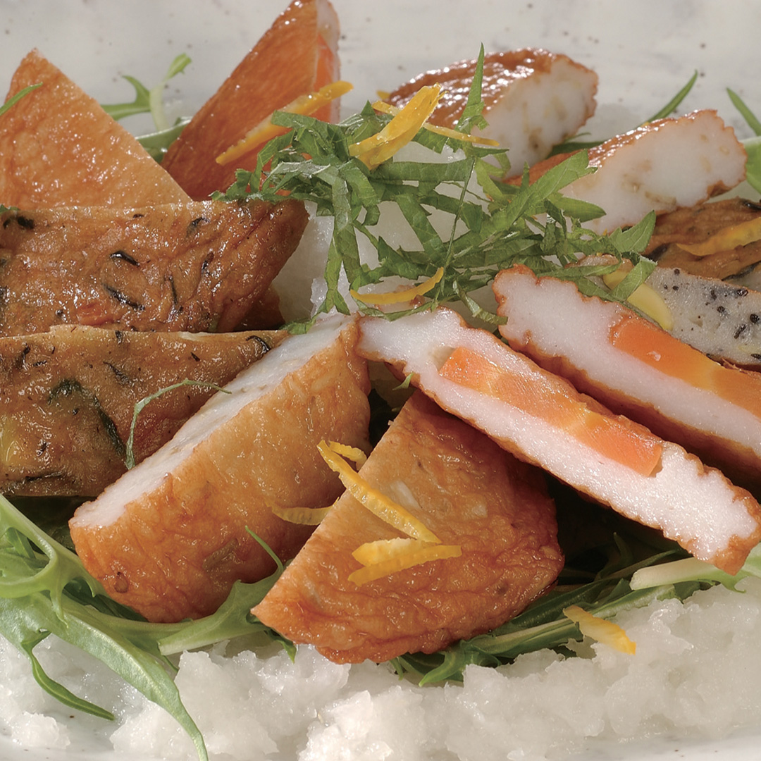 特揚げは、エソ、タラ等を使用し、薩摩の地酒をいれ菜種油できつね色に揚げています。鹿児島を代表する味です。