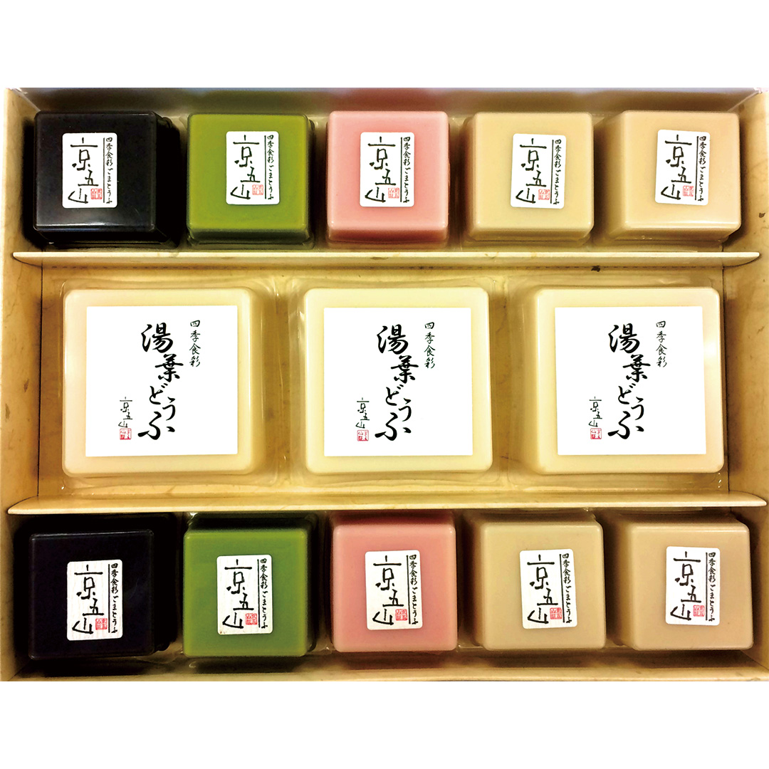 京都 北野天満宮傍の胡麻豆腐専門店「京五山」の人気商品、ごまとうふと湯葉どうふの詰合せとなります。いろんな味を食べ比べられるちょっと贅沢な詰合せです。