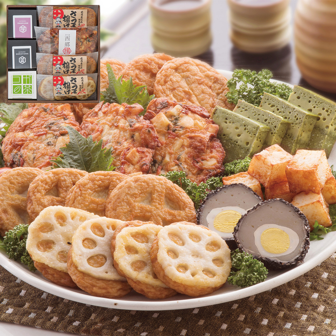 第70回の全国蒲鉾品評会にて水産庁長官賞を受賞した「芋キューブ」、特別賞の「コガ茶」、鹿児島県さつま揚げ青年部で共同開発した「西郷揚げ」などを詰合せました。