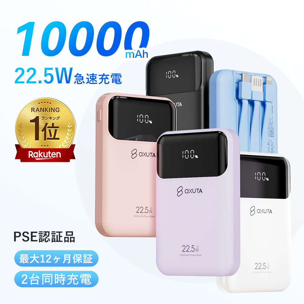 モバイルバッテリー iphone 10000mAh 残量表示 22.5w 3本 ケーブル内蔵 Lightning Type-c コネクター内蔵 軽量 超コンパクト