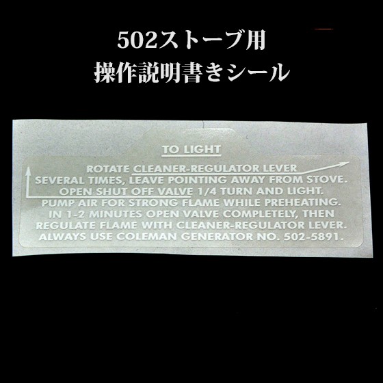 502ストーブ用補修シールです。オリジナルがボロボロでしたら、見栄えが良くなります。他にコールマンアイテムやキャンプアイテムなどへの貼付にも最適です。
