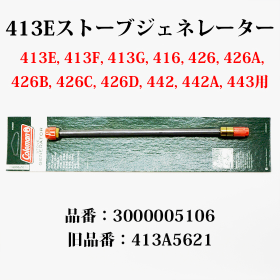 米国コールマン社製の416 413Eストーブ用ジェネレーター、品番:3000005106 旧品番:413A5621です。コールマンの2バーナーストーブ 413E, 413F, 413G, 416, 426, 426A, 426B, 426C, 426D, 442, 442A, 3バーナーの443に適合します。人気のオールドアルミツーバーナー442 443用やゴールドボンドの大きい方のツーバーナー413Gのジェネレーターです。交換パーツまたは予備に、この機会にいかがでしょうか?
