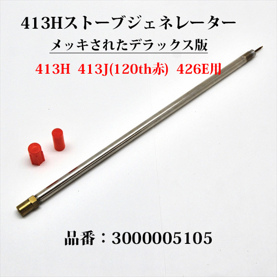 こちら販売品は統一品番表示しており、ノーマルバージョンの国内品番と番号が重複していますが、こちらはメッキバージョーンです。メッキの違いのみでノーマルバージョンと同じジェネレーターです。2021年春の販売された赤の120thアニバーサリーの2バーナーストーブ 413Jは、このメッキジェネレーターが装着されています。