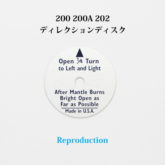 200系シングルマントルランタンのバルブホイール前面にはめるディレクションディスク、リプロ新品、オリジナルと同じくアルミ板、1950-75年ごろまでの200 200A 202が対象デザインです。文字フォントなどの出来はオリジナルに近いと思います。