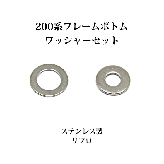 200系フレームボトムのワッシャーセット、インチ規格、大と小の2枚、リプロ新品、フレーム装着を安定してさせる役目をします。オリジナルはスチール製とブラス製が存在しますが、こちらはステンレス製となります。このワッシャーは小の1枚から始まり、途中のどこかで大小の2枚となりました。購入時に欠品の個体が多く、またメンテ中に紛失しやすい部品です。何気ない部品ですが、お探しの方、いかがでしょうか?