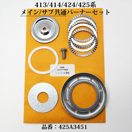コールマン 413 414 424 425系 メイン・サブ共通のバーナーリング フルセット、品番:425A3451 413D3461です。サブバーナーにお使いの際はバーナーリング一番下の円盤状のパーツ(ボトムディスク)を除外して取り付けてください。料理中の吹きこぼしや長期保管による錆びで、調子を落としていませんか?交換パーツまたは予備に、この機会にいかがでしょうか?
