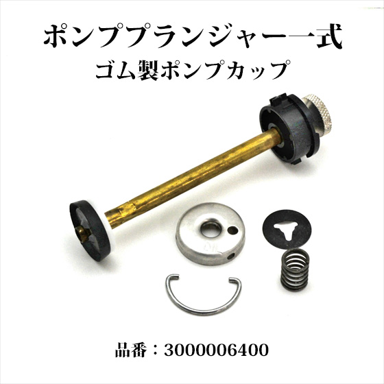 ポンププランジャー一式、ゴム製ポンプカップ、品番:3000006400です。メタルとプラスチック製のポンプキャップの両方が付属していますので、適合するキャップを選択して装着します。ポンプカップはゴム製ですが、革製への交換も可能です。交換パーツ、または、予備にいかがでしょうか?
