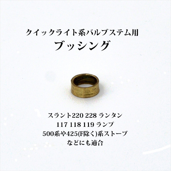 クイックライトのランプ・ランタン系バルブステム用のブッシング、リプロ新品です。写真4枚目以降の通り、この部分に装着する部品です。これがないと、グラファイトパッキンの取付け圧縮の際、はみ出しを確実に抑えることができません。紛失してしまった方、もしくは、元々なかった方へ、いかがでしょうか?