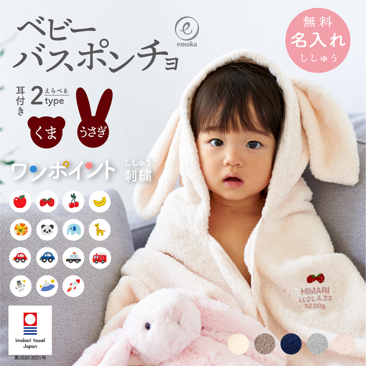 | 商品説明 | 【emoka くま & うさぎ 耳つき バスポンチョ】 emokaのバスポンチョは日本一のタオル産地、『愛媛県今治市』で生産しております。 デリケートな赤ちゃんの肌にも使える、ふっくらやわらかな肌触りが特徴 |