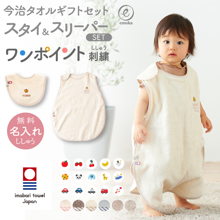 | 商品説明 | 日本一のタオル産地『愛媛県今治市』で生産されたスタイとスリーパーのセットです。 デリケートな赤ちゃんの肌にも使える、ふっくらやわらかな肌触りが特徴です。 高級コットンの糸を贅沢に使用しており、タオル生地の素早い吸水性と柔らかい肌触りが長期間持続する特殊加工を施すことで、洗濯を繰り返しても柔らかさが長時間持続し贅沢な感触が長持ちします。 パンダやバナナなど6種類から選べる ”ワンポイント刺繍” とお名前刺繍を入れることができます。 お名前の刺繍糸色は14色からお選びいただけるので、より特別なギフトに。 大切なお友達やご家族への贈り物にもおすすめです。 ギフトBOXに入れてお届け。 【無料ラッピング承ります】 |