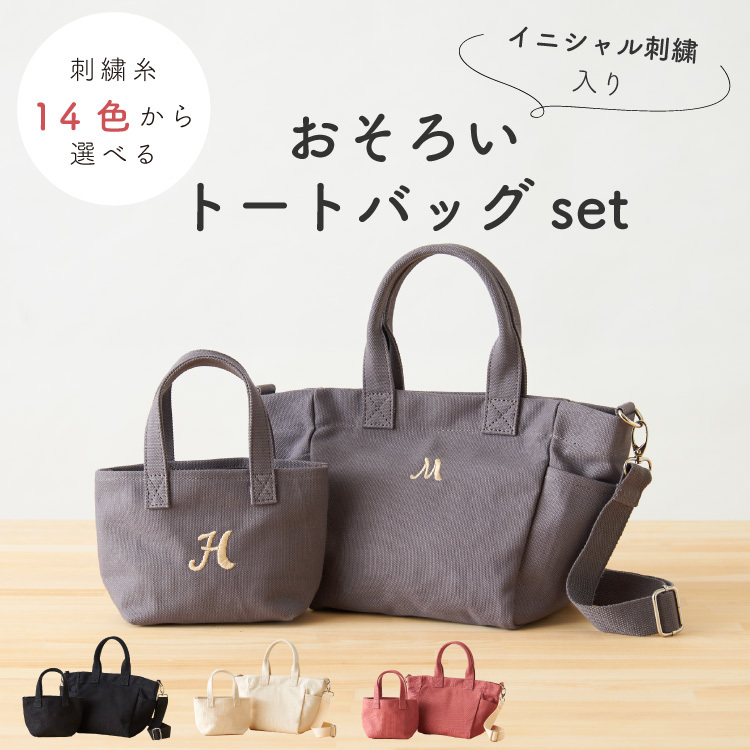 | 商品説明 | 【 イニシャル刺繍入り お揃いトートバッグset 】 親子でリンクコーデを楽しめる! ママに向けたミニトートバッグと、ベビーに向けたサイズ感の可愛いトートバッグのセット商品です。 ■2wayミニトート しっかりした帆布生地を使用。毎日気兼ねなくお使いいただけます。 また、手持ちと肩掛けの2way仕様なので、両手を開けることができるのも嬉しいポイントです。 公園や通勤、ちょっとそこまでから、旅行などにも重宝します。 1つあると便利な、おしゃれさと実用性を兼ね備えたミニトートです。 ■ベビートート ママとお揃いを意識した同素材の小さなトートバッグ。 お気に入りのおもちゃや、ぬいぐるみを入れて遊ぶことができます。 おままごとバッグにもぴったり! □イニシャル刺繍□ それぞれのトートバッグにお好きなイニシャル刺繍を入れることができます。 刺繍は糸カラー14色よりお選びいただけますので、 自分だけの特別なバッグを作ることができます! 大切なお友達やご家族の贈り物にもおすすめです。 [プレゼント用無料ラッピング承ります] |