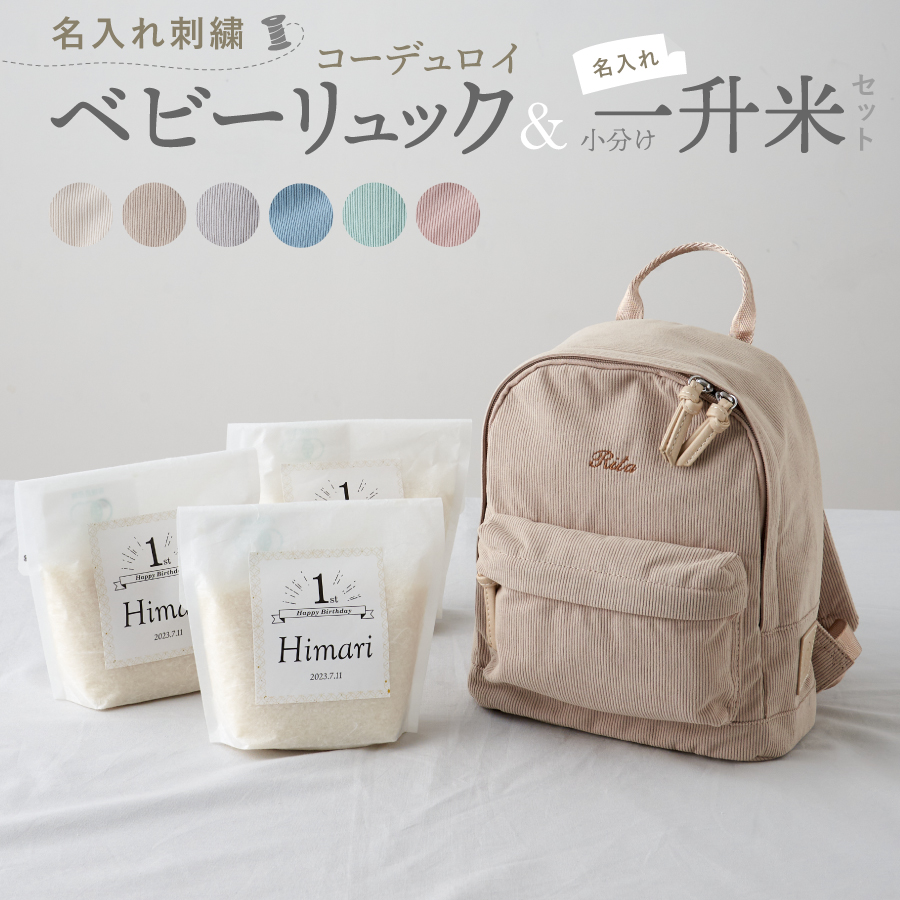 | サイズ | 【ベビーリュック】 約H28cm × W25cm マチ10cm 肩ひも24-58cm(調節可) 【一升米(小分け)】 幅:約15cm 高さ:約24cm(上部折り畳み時14cm)厚み:約5cm |