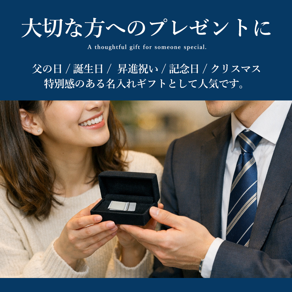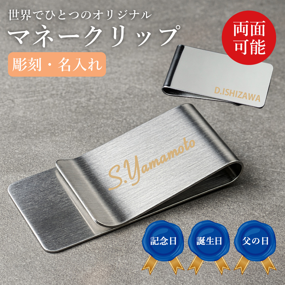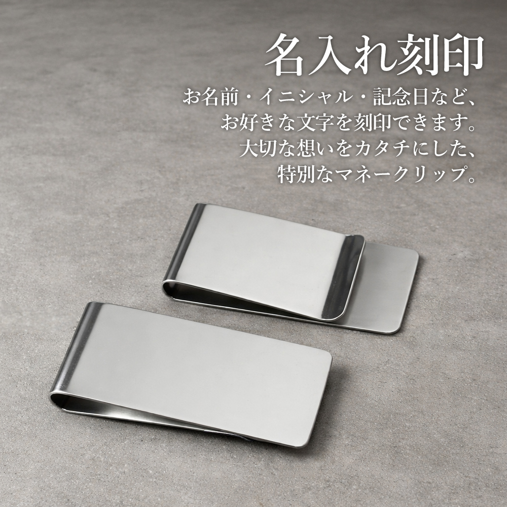 名入れマネークリップは、名前やイニシャルを刻印できる特別なアイテムです。名入れステンレス製マネークリップは、世界にひとつだけのオリジナルギフトとして人気があり、記念日や誕生日、父の日などのプレゼントにも最適。シンプルで高級感のあるデザインの名入れステンレス製マネークリップは、ビジネスシーンでもスマートに使えるメンズアクセサリーとして多くの方に選ばれています。