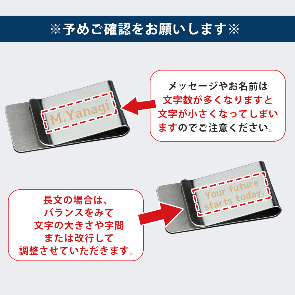 シンプルながらも上品な輝きが魅力のアイテムです。名入れステンレス製マネークリップは、メンズギフトやプレゼントとして人気が高く、誕生日、父の日、記念日、就職祝いなどさまざまなシーンにぴったり。高級感のあるシルバーカラーの名入れステンレス製マネークリップは、日常使いからビジネスシーンまで幅広く活躍します。