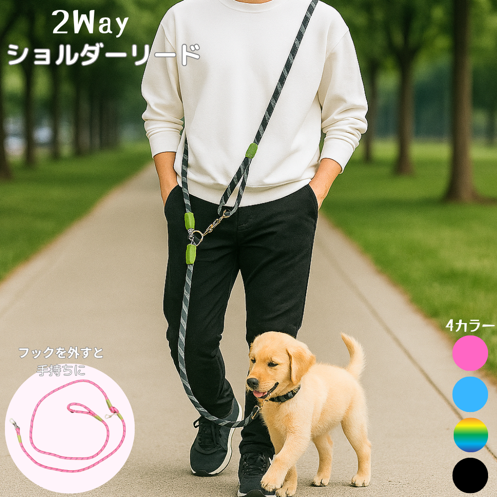 犬用リード 肩掛け ショルダー 両手が使える ハンズフリー ロングリード 長さ調整可 小型犬 中型犬対応 多頭引き 登山ロープ素材 ナイロン 反射素材入り 夜間対応 丈夫 頑丈 軽量 絡まりにくい 壊れにくい おしゃれ スタイリッシュ 散歩 お出かけ 旅行 カフェ 室内外兼用 ドッグラン対応 トレーニング 運動向き 送料無料 ギフトにもおすすめ